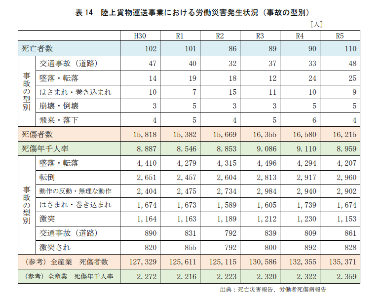 厚生労働省の「令和5年労働災害発生状況の分析等」によると、令和5年(2023年)の陸運貨物運送事業の死傷事故(休業4日以上)件数は16,215件で、意外なことに建設業の14,414件を上回っていることがわかります。(新型コロナウイルス感染症の罹患による労働災害を除く)
